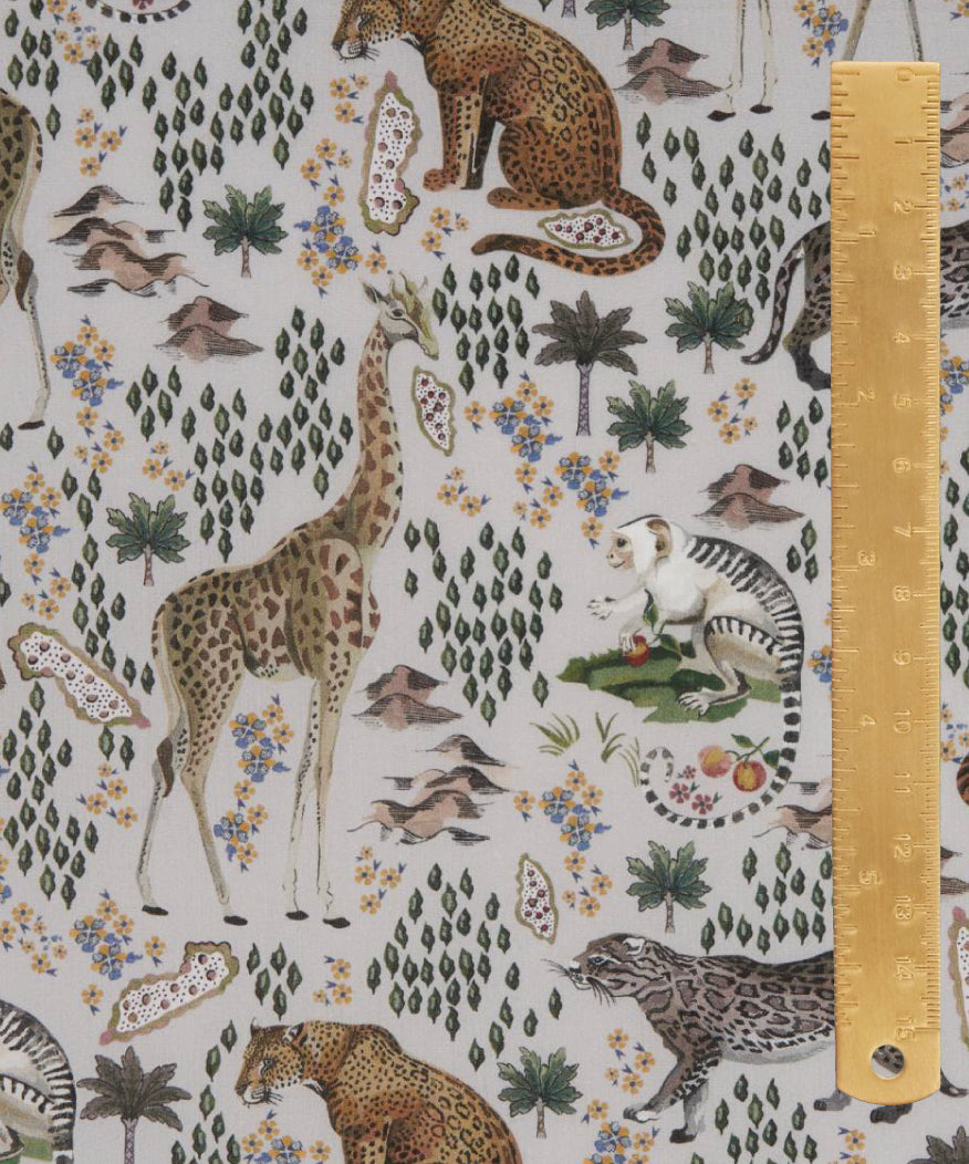 Championing the natural markings found on elegant safari animals, this design is a riot of pattern and colour. Painted in the Liberty Design Studio using gouache paints and fine brushes to add fastidious detail - leopards, giraffes, ocelots and monkeys sit within a landscape of mountains, palm trees and tiny, fragrant blossoms and fruit.