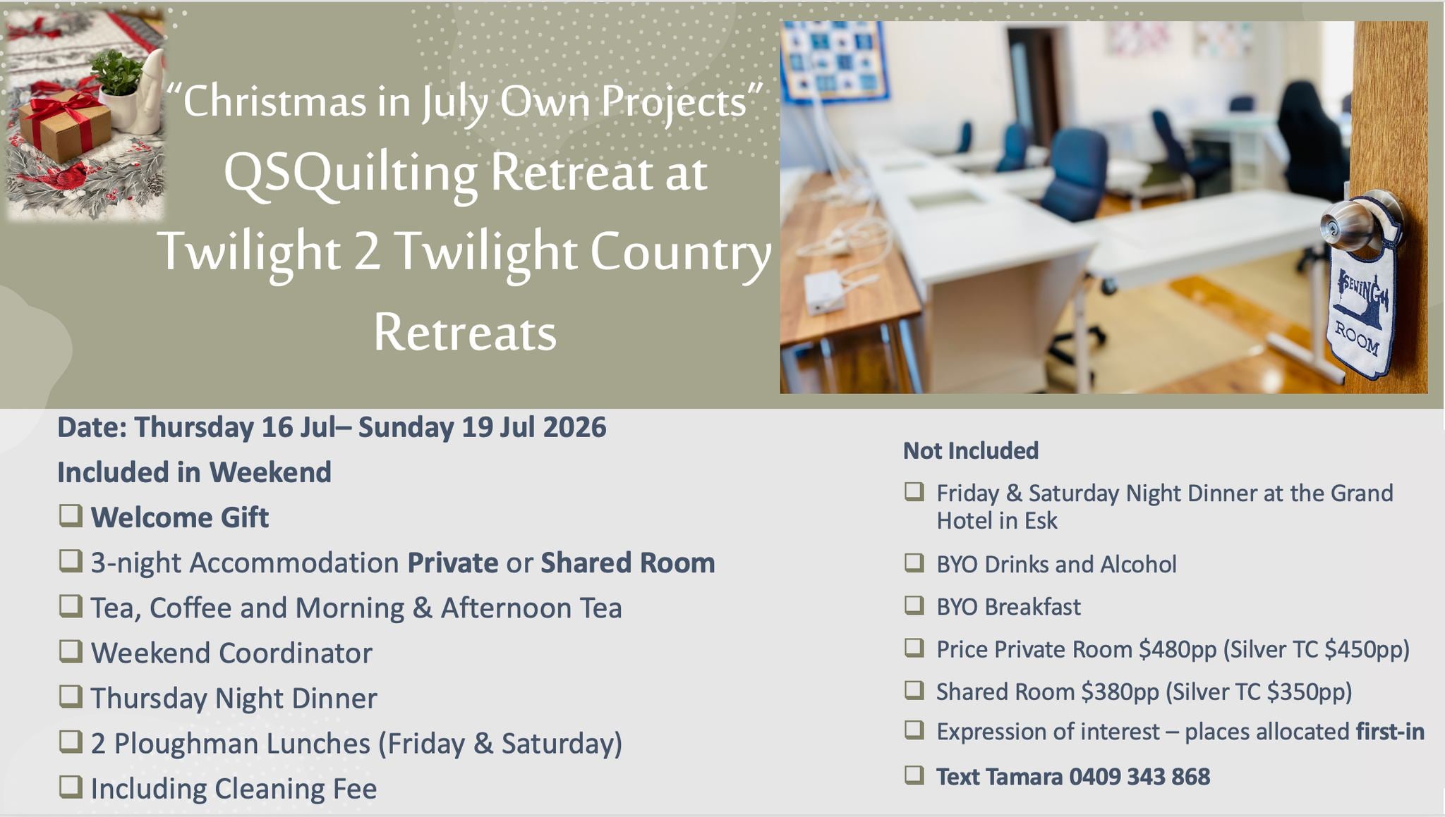 - Private Room $480pp (Silver TC $450pp) GST Inclusive